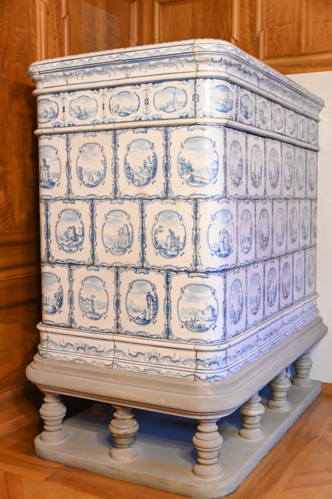 Werfen wir einen Blick in die Mitte des 18. Jahrhunderts. Die Stadt und Republik Bern befindet sich im Zenit ihrer Macht und zählt zu den bedeutendsten Stadtstaaten nördlich der Alpen. Das Territorium der Republik reicht vom Genfersee bis in den Aargau und umfasst weite Teile der heutigen Westschweiz. Es ist die Ära des Ancien Régime, Bern wird durch die Patrizierfamilien absolutistisch regiert. Wohlstand, politischer Einfluss und Selbstbewusstsein prägen die Stadt. Es wird gebaut, modernisiert und repräsentiert. Der Ofen ist damit eingebettet in eine Zeit des Ausbaus, nicht nur der Infrastruktur, sondern auch des städtischen Selbstverständnisses. Doch selbst der prächtigste Neubau war im Winter ohne Heizung wenig komfortabel. Hier kommen die Kachelöfen ins Spiel. Die Öfen dieser Zeit wurden nicht mehr in der Stube selbst befeuert, sondern vom Gang aus. Rauch, Russ und Asche blieben somit draussen. Die grosse Masse der Kacheln speicherte die Wärme und gab sie über Stunden sanft in den Raum ab. Noch spannender als die Technik ist jedoch das Äussere. Neben den traditionellen grün glasierten Öfen des 16. und 17. Jahrhunderts wurden im 18. Jahrhundert zunehmend hell bemalte, weiss-blau dekorierte Kachelöfen beliebt. Inspiriert vom kostbaren Porzellan entwickelte sich die Fayence-Malerei zu einem Ausdruck gehobenen Geschmacks. Der helle Kachelgrund wurde zur Leinwand für kontrastreiche Fantasielandschaften und verspielte Motive.