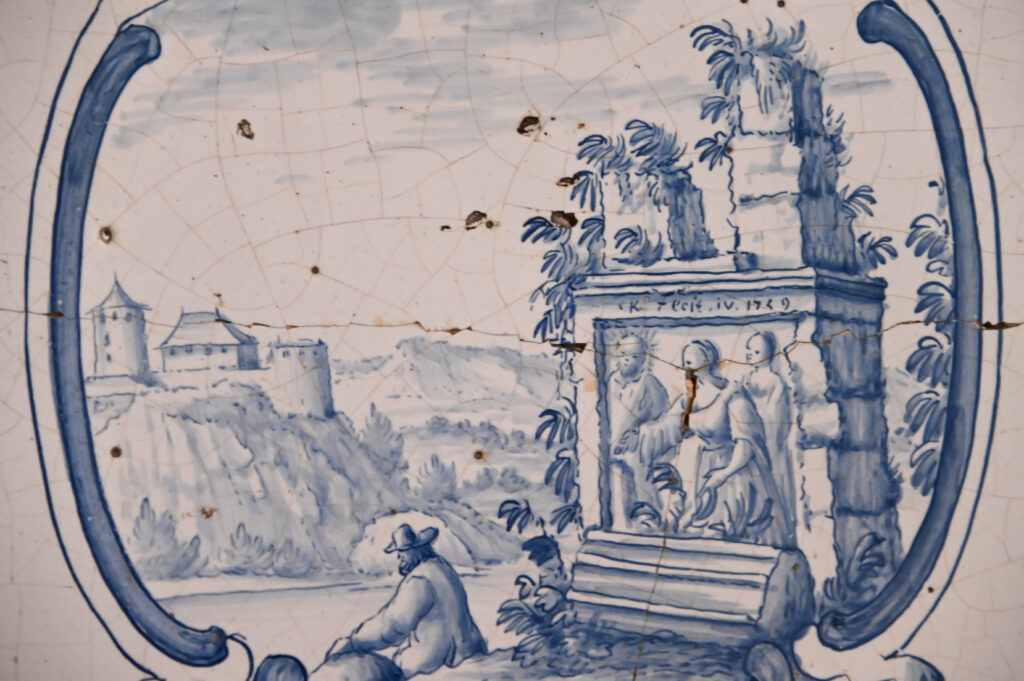 Genau in diese Tradition gehört auch unser Ofen. Es handelt sich um einen für die Zeit typischen Kastenofen auf Sandsteinfüssen. Oben und unten rahmen sogenannte Frieskacheln drei Reihen grösserer Füllkacheln ein. Die Kacheln sind im charakteristischen weiss-blauen Fayence-Stil bemalt. Zu sehen sind «Fantasie»- oder «Ideallandschaften»: verfallene Ruinen, Schlösser auf Hügeln, üppige Bäume und weite Horizonte. Und doch birgt der Ofen ein Detail, das erst bei genauem Hinsehen auffällt.